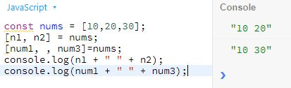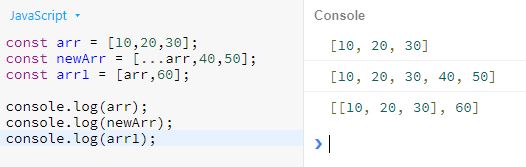 const arr = [10,20,30]; const newArr = [...arr,40,50]; console.log(arr); console.log(newArr);