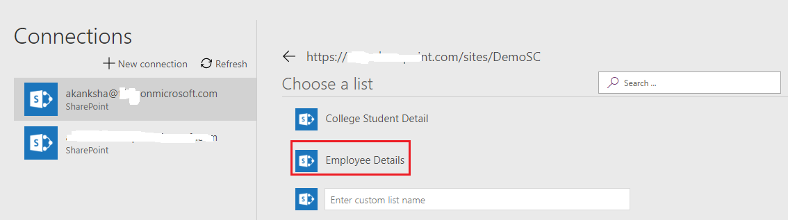 When you select a Site Collection, you will see a list of exiting Lists. You can now choose a List. If your list name does not exist, enter the name manually in the given text box. I will be choosing Employee Details here. Once selected, click on Connect on bottom right corner of the screen.