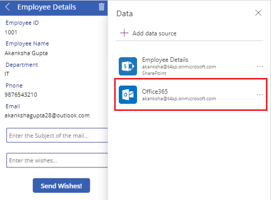 As we want to send an email when we click on a button, we have to add a data source of Office 365. Click on View menu –> Data Sources. Click on Add data source. Select Office 365.