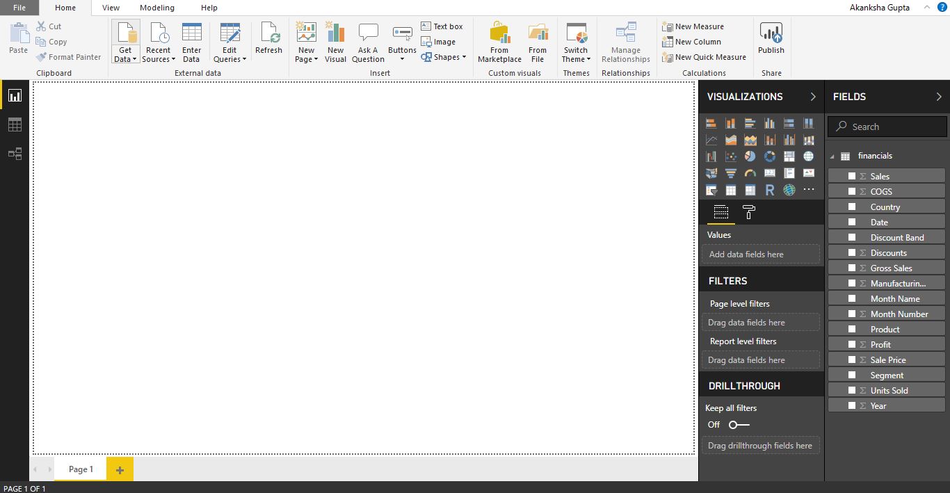 When you close the Welcome screen, you will see the Report view of PowerBI Desktop.