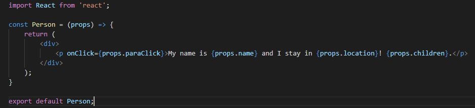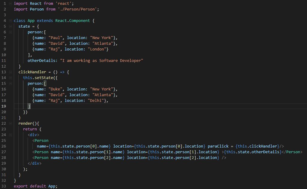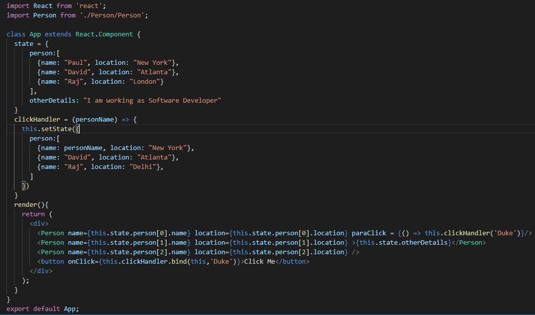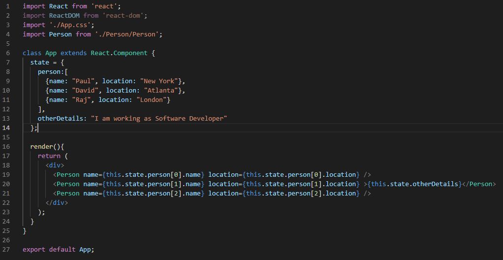 Below is the code in App.js file. The changes are done only in App.js file. No code changes are done in Person.js.